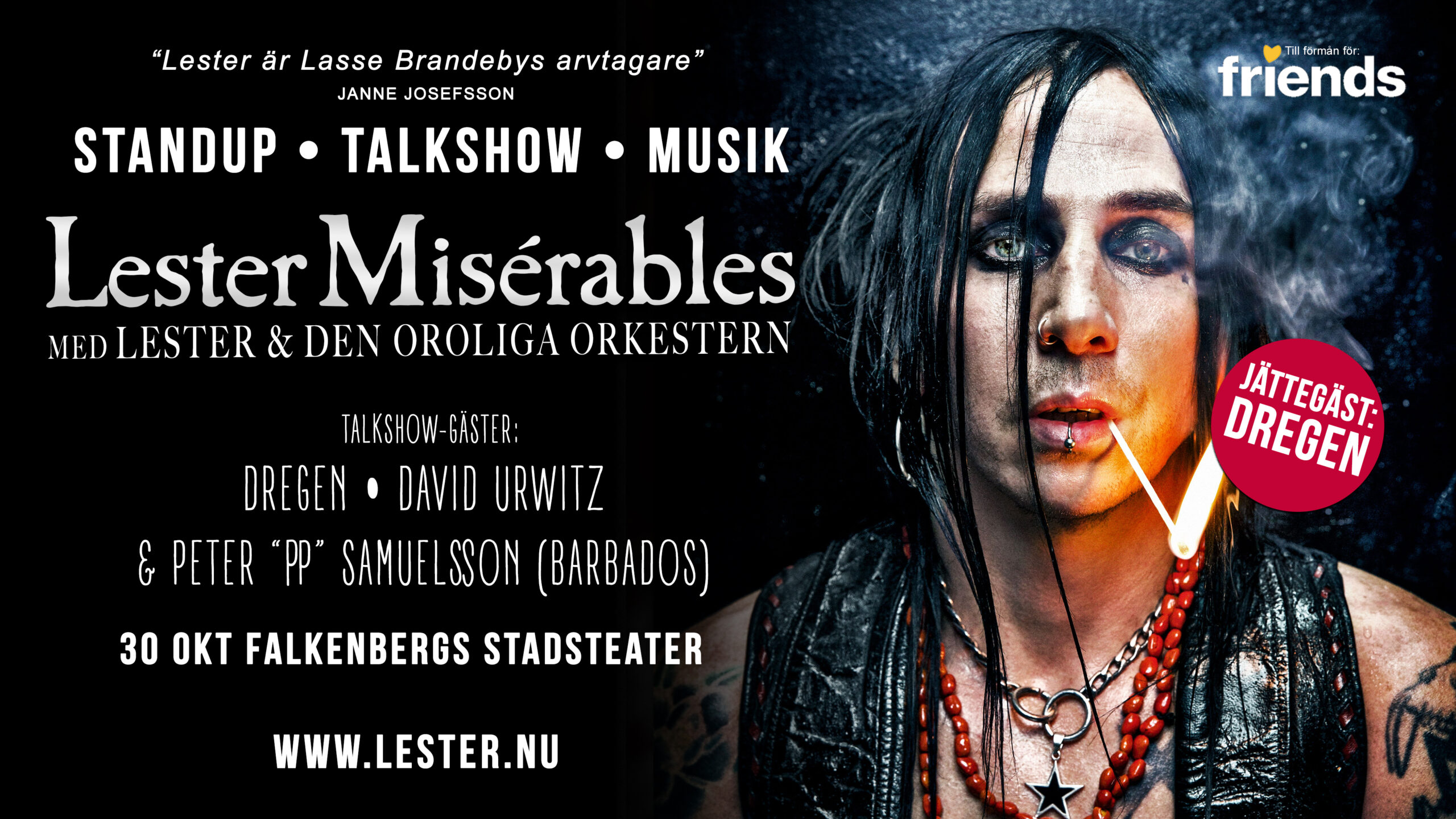 Komikern Markus “Lester” Qvist ger sig ut på turné med “Lester Misérables”, en uppånervänd humorshow med full orkester och välkända gäster på scen. Jättegäster 30/10: DREGEN, Peter ”PP” Samuelsson och David Urwitz. Allt till förmån för FRIENDS i kampen mot mobbning.